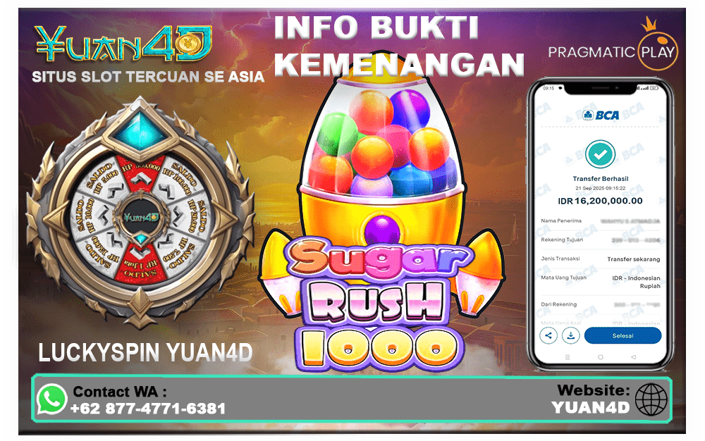 YUAN4D – Bukti Maxwin Slot Sugar Rush 1000 di YUAN4D. Sugar Rush 1000 adalah salah satu game slot populer dari Pragmatic Play yang terkenal dengan tampilan warna-warni penuh permen serta peluang jackpot besar. Selain itu, slot ini sangat digemari karena mekanisme cluster pays yang memungkinkan pemain menang berkali-kali dalam satu spin. Tidak mengherankan jika banyak pemain berhasil meraih kemenangan spektakuler dari modal kecil.