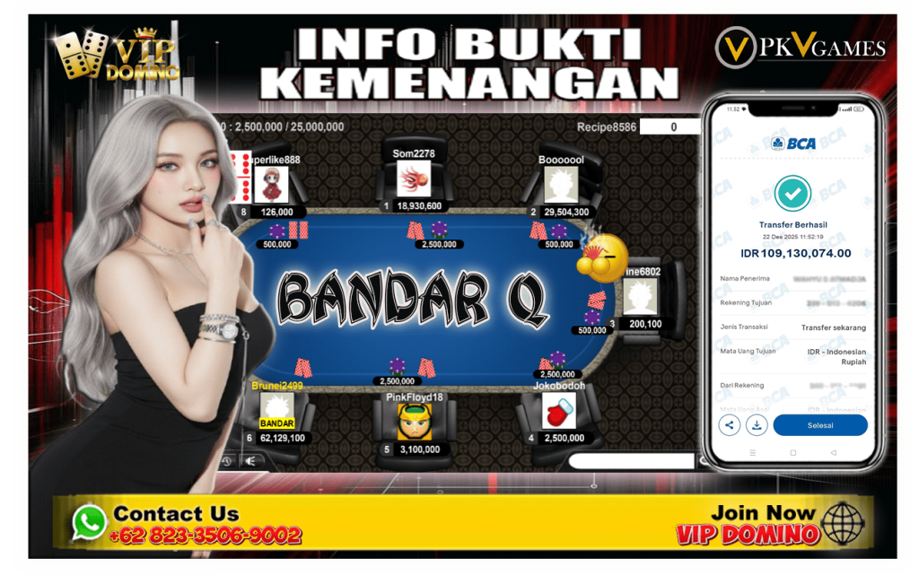 VIP DOMINO – Hari Ini Auto Cuan! Bermain BandarQ di VIPDOMINO Terbaik Raih Kemenangan 109.130.074. kembali menjadi momen luar biasa bagi salah satu pemain VIPDOMINO terbaik. Lewat permainan BandarQ, pemain tersebut sukses meraih kemenangan fantastis hingga 109.130.074 rupiah dalam satu sesi permainan yang berjalan mulus, panas, dan penuh kendali. Angka ini tentu bukan nominal kecil dan langsung menjadi bukti nyata bahwa BandarQ di VIPDOMINO masih sangat gacor.