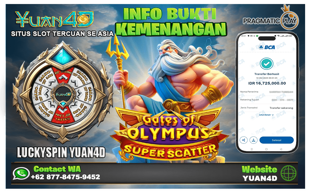 YUAN4D – Kemenangan Besar Gates of Olympus Super Scatter di YUAN4D Game Gates of Olympus dari Pragmatic Play sudah lama jadi favorit pemain slot online. Dengan tema dewa-dewa Yunani dan multiplier besar, game ini selalu menghadirkan sensasi luar biasa. Versi Super Scatter di YUAN4D menghadirkan peluang lebih besar untuk memicu fitur bonus, sehingga potensi hadiah pun semakin menggoda. Baru-baru ini, seorang pemain berhasil memicu Super Scatter dan memenangkan hadiah spektakuler di YUAN4D.