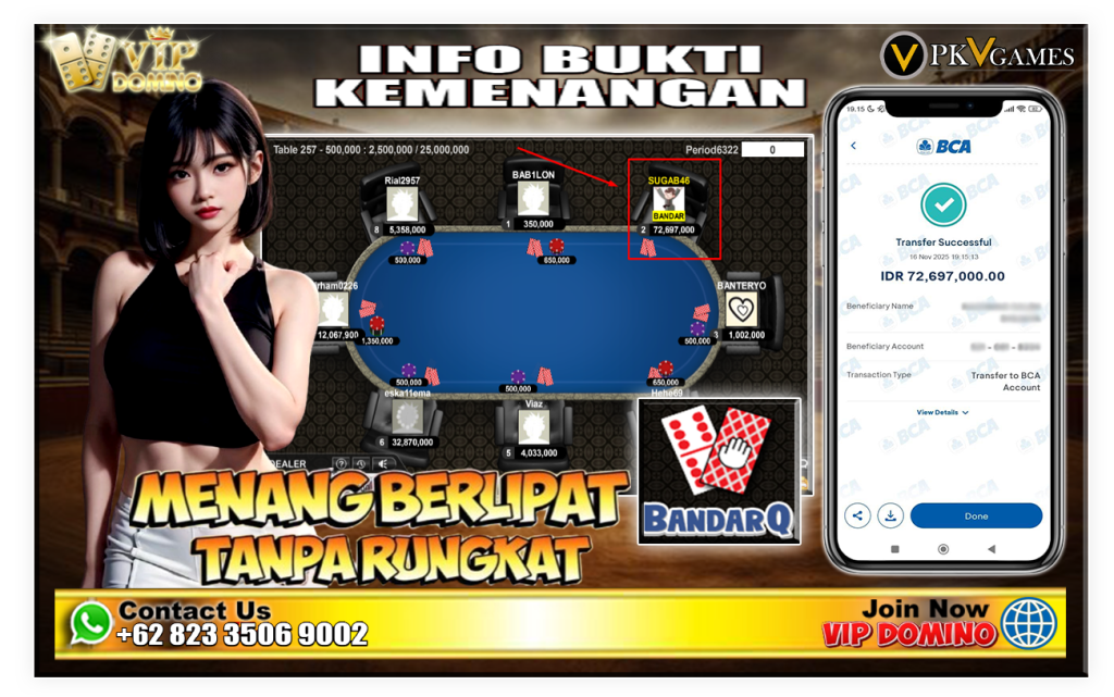 VIPDOMINO – Kemenangan Manis 72 Juta! Member VIP DOMINO. Dunia PKV Games kembali digemparkan oleh kemenangan besar dari salah satu member setia VIP DOMINO. Kali ini, kemenangan spektakuler sebesar Rp72.000.000 tercatat dari permainan BandarQ, game yang dikenal memadukan keberuntungan dan strategi tajam.