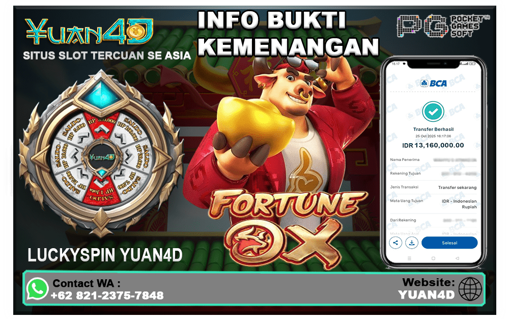 YUAN4D – Superwin Fortune Ox di YUAN4D. Slot online Fortune Ox dari PG Soft kembali membuktikan diri sebagai permainan yang penuh keberuntungan. Banyak pemain di YUAN4D berhasil meraih Superwin fantastis hanya dengan modal kecil, berkat kombinasi fitur bonus yang menarik dan peluang pengganda kemenangan yang luar biasa tinggi. Selain itu, tampilan visual bernuansa oriental membuat permainan ini terasa elegan dan menenangkan, namun tetap menegangkan di setiap putarannya.
