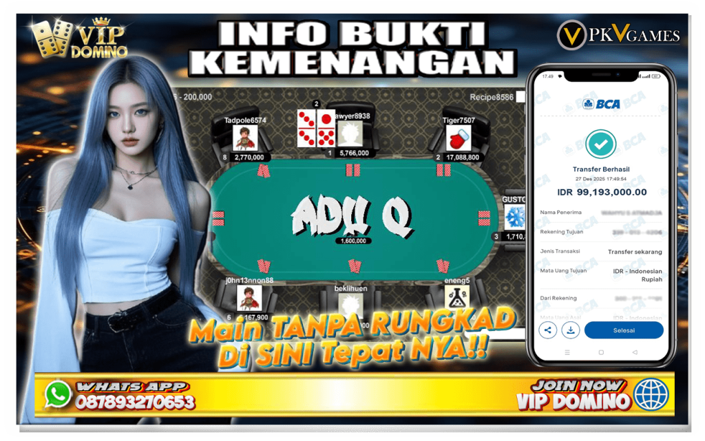 VIP DOMINO -VIP Domino Kece Abis! Gabungan Domino99 dan Adu Q Antar Pemain Raih Kemenangan 99.193.000. Kabar kemenangan besar kembali datang dari VIP Domino, platform permainan online favorit para pemain. Pada sesi permainan terbaru, seorang member sukses meraih kemenangan fantastis hingga 99.193.000 rupiah melalui perpaduan permainan Domino99 dan Adu Q. Hasil ini membuktikan bahwa VIP Domino memang sedang berada di kondisi paling gacor dan penuh peluang cuan.
